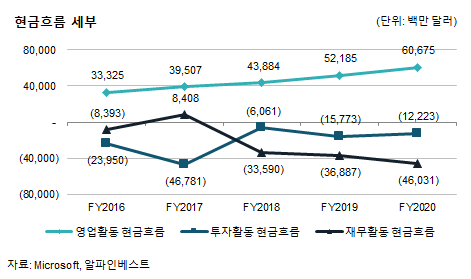 마이크로소프트의 영업활동 현금흐름은 2016년 333억 달러에서 2020년 607억 달러로 80% 이상 증가했으며, 금융상품과 유형자산 취득, 사업결합 등으로 인해 음(-)의 투자활동 현금흐름이 발생하고 있습니다. 2017년, 400억 달러 이상 회사채를 발행하고 대규모의 사업결합을 추진하면서 투자활동 현금흐름이 (-)468억 달러, 재무활동 현금흐름이 (+)84억 달러를 기록하기도 했습니다. 한편, 2017년을 제외한 회계연도에서 음(-)의 재무활동 현금흐름이 발생했습니다.