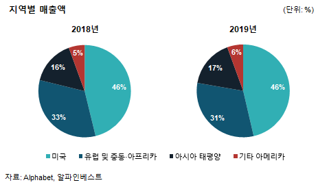 2019년 구글의 매출을 지역별로 살펴보면 미국이 46%로 가장 높은 매출 비중을 차지하며, 유럽, 중동 및 아프리카(EMEA), 아시아 태평양(APAC), 기타 아메리카(미국을 제외한 북미와 중남미 국가) 순으로 이어지고 있습니다. 애플, 아마존과 마찬가지로 구글 또한 2018년 대비 큰 변화 없이 안정적인 지역별 매출 분포를 나타내고 있습니다.