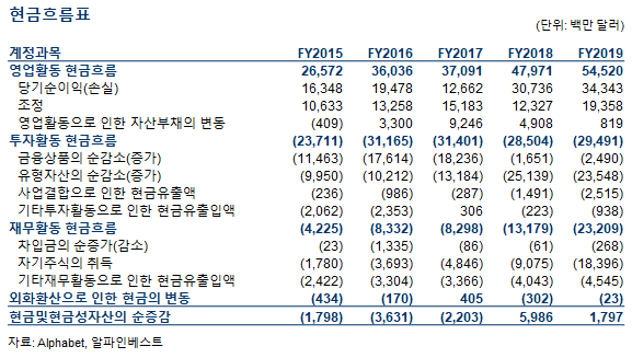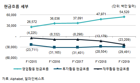 구글의 영업활동 현금흐름은 2015년 266억 달러에서 2019년 545억 달러로 2배가량 증가했습니다. 당기순이익의 꾸준한 증가가 영업활동 현금흐름의 상승을 주도하고 있습니다. 한편, 금융상품과 유형자산 취득, 사업결합 등으로 인해 음(-)의 투자활동 현금흐름이 발생하고 있습니다. 차입금 발행 및 자기주식의 취득 등으로 재무활동 현금흐름 또한 음(-)의 재무활동 현금흐름이 꾸준히 발생하고 있습니다. 특히, 재무활동 현금흐름 중 큰 비중을 차지하는 자기주식의 취득액이 크게 증가했습니다. 이를 통해 구글이 주주 환원 정책에도 신경을 쓰고 있다는 사실을 알 수 있습니다.