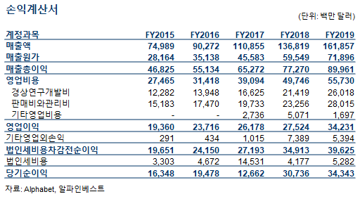 구글의 손익계산서는 아마존과 같이, 거대한 회사 규모에도 불구하고 회사의 운영 성과가 지속적으로 증가하는 우량 기업의 모습을 보여주고 있습니다. 구글의 매출액은 2015년 750억 달러에서 2019년 1,619억 달러로 약 116% 성장했습니다.