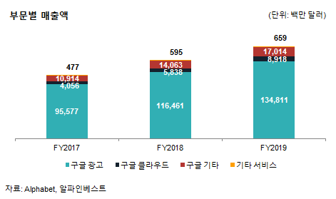 구글 광고 부문의 매출은 구글 닷컴을 이용한 검색 수수료, 유튜브 광고, 구글 네트워크 멤버(애드센스 등)로부터 창출됩니다. 구글 클라우드 부분은 구글 클라우드 플랫폼(GCP; Google Cloud Platform), G Suite 및 기타 엔터프라이즈 클라우드 서비스로 이루어져 있습니다.