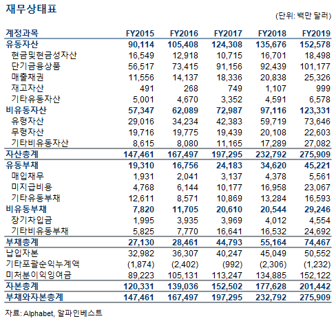 구글의 총자산은 2015년 1,475억 달러에서 2019년 2,759억 달러로 약 87% 증가했습니다. 토지 및 건물, IT 관련 자산 등 유형자산 투자가 꾸준히 증가하고 있으며 회계기준 개정에 따른 운용리스 자산 인식으로 2019년 기타비유동자산이 크게 증가했습니다.