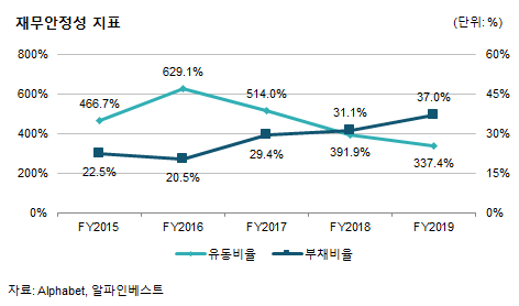 유동자산에서 유동부채를 나눈 지표로서 유동성과 재무안정성을 나타내는 유동비율은 2016년 629%까지 상승한 이후 지속적으로 감소하고 있습니다. 2019년 말 기준 유동비율 337%는 애플, 아마존, 마이크로소프트 등 다른 빅 테크 기업보다 높은 상황이나, 유동부채가 빠르게 증가하고 있다는 점에서 향후 하락세의 지속 여부를 체크해야 할 것으로 보입니다. 한편, 자본 대비 부채의 크기를 나타내는 부채비율은 2015년 23%에서 2019년 37%로 서서히 증가하고 있습니다.