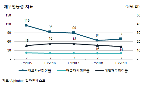 재고자산이 영업활동을 통해 판매된 후 매출원가로 회전하는 속도를 의미하는 재고자산회전율은 2015년 115회에서 2019년 68회로 약 40% 감소했습니다. 이는 매출원가보다 재고자산 잔액의 증가폭이 더 크다는 것을 의미합니다. 2019년 말 재고자산은 10억 달러로 금액이 타 자산 대비 크지 않지만, 제조업에 해당하지 않는 구글에서 재고자산이 무엇을 의미하는지와 매년 잔액이 증가하는 사유를 체크해야 할 것으로 보입니다. 한편, 구글의 매출채권회전율과 매입채무회전율은 큰 변화 없이 일정 수준을 유지하고 있습니다.